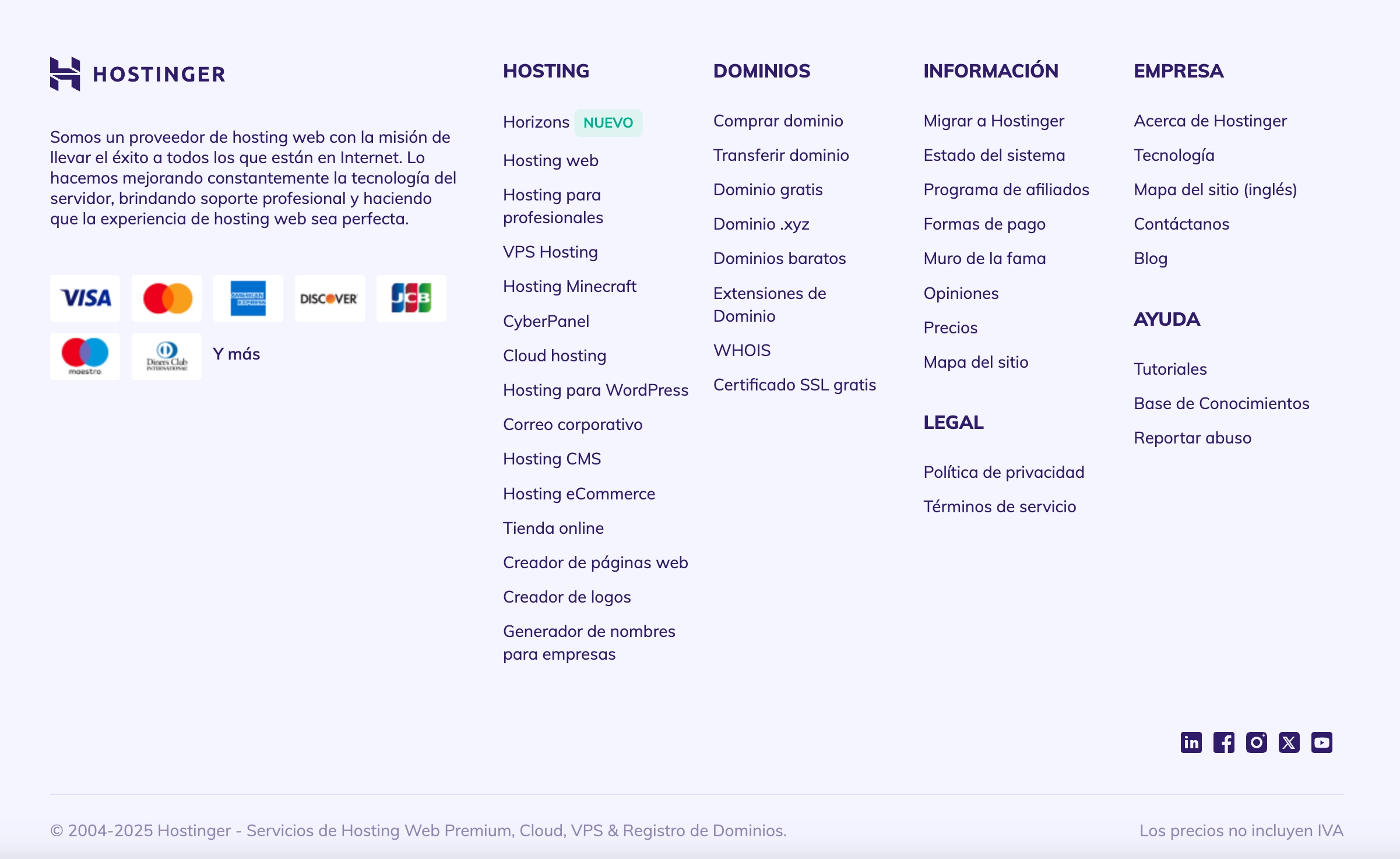Algunos proveedores de Hosting que recomiendo son Hostinger, que ofrece opciones accesibles y confiables para todo tipo de sitios web, desde hosting compartido hasta VPS; Bluehost, SiteGround y HostGator.